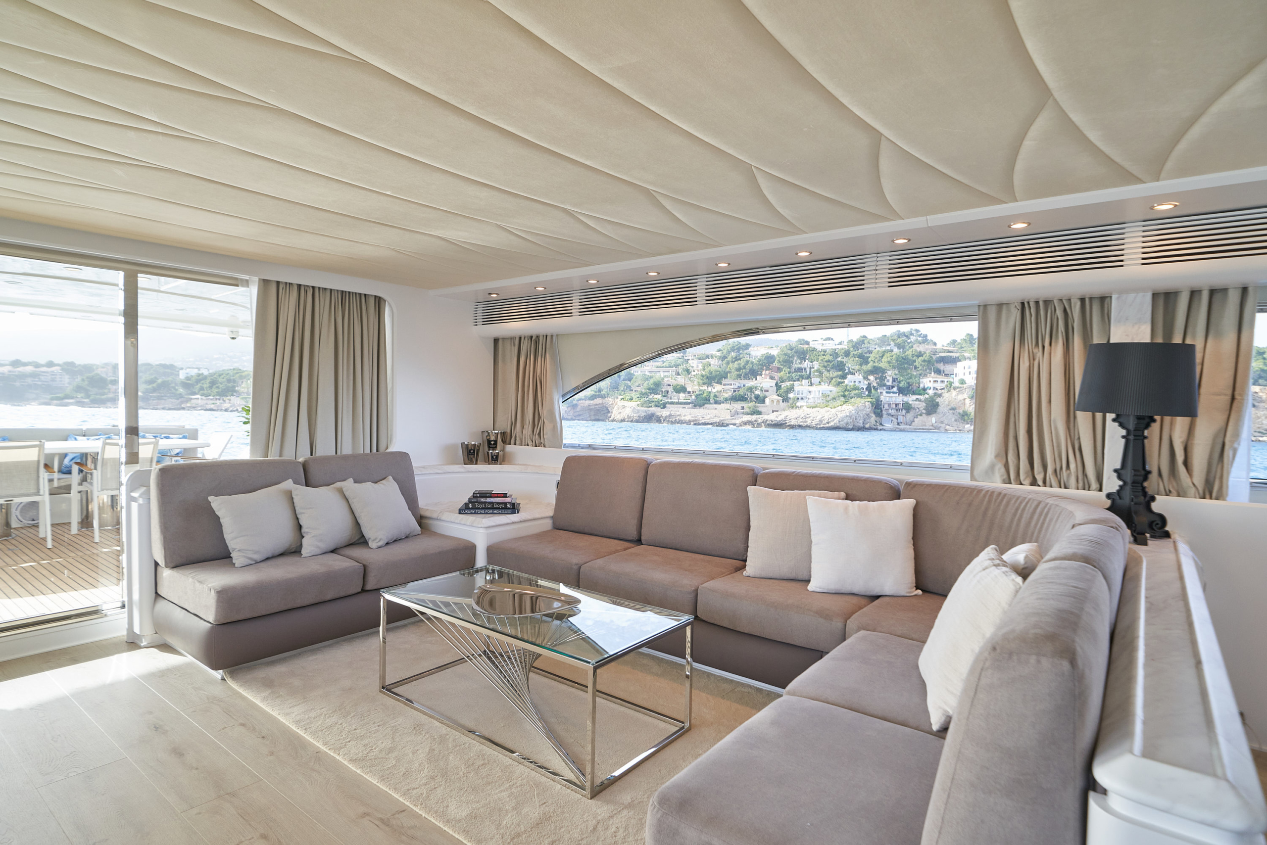 The main salon and dining are set in a contemporary open plan, featuring a generous lounge aft and elegant formal dining forward. The lounge offers ample seating, a coffee table and entertainment systems. Forward, guests may dine in style.