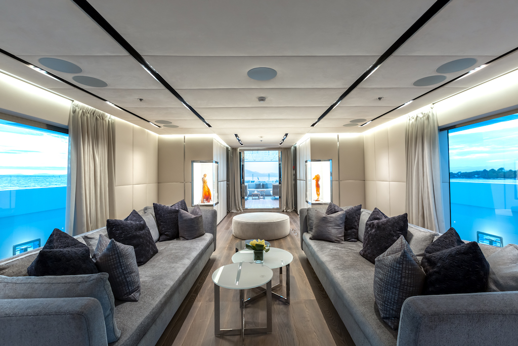 On the upper bridge deck aft has a generous seating area and coffee tables, perfect for an evening aperitif.