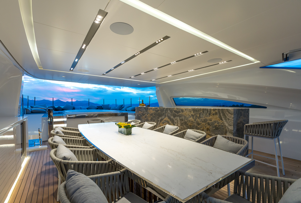 The main deck boasts the salon and formal dining, set in an open plan and surrounded by ample panoramic windows for optimum natural light. A foyer to starboard leads forward to a full beam master cabin and private study.