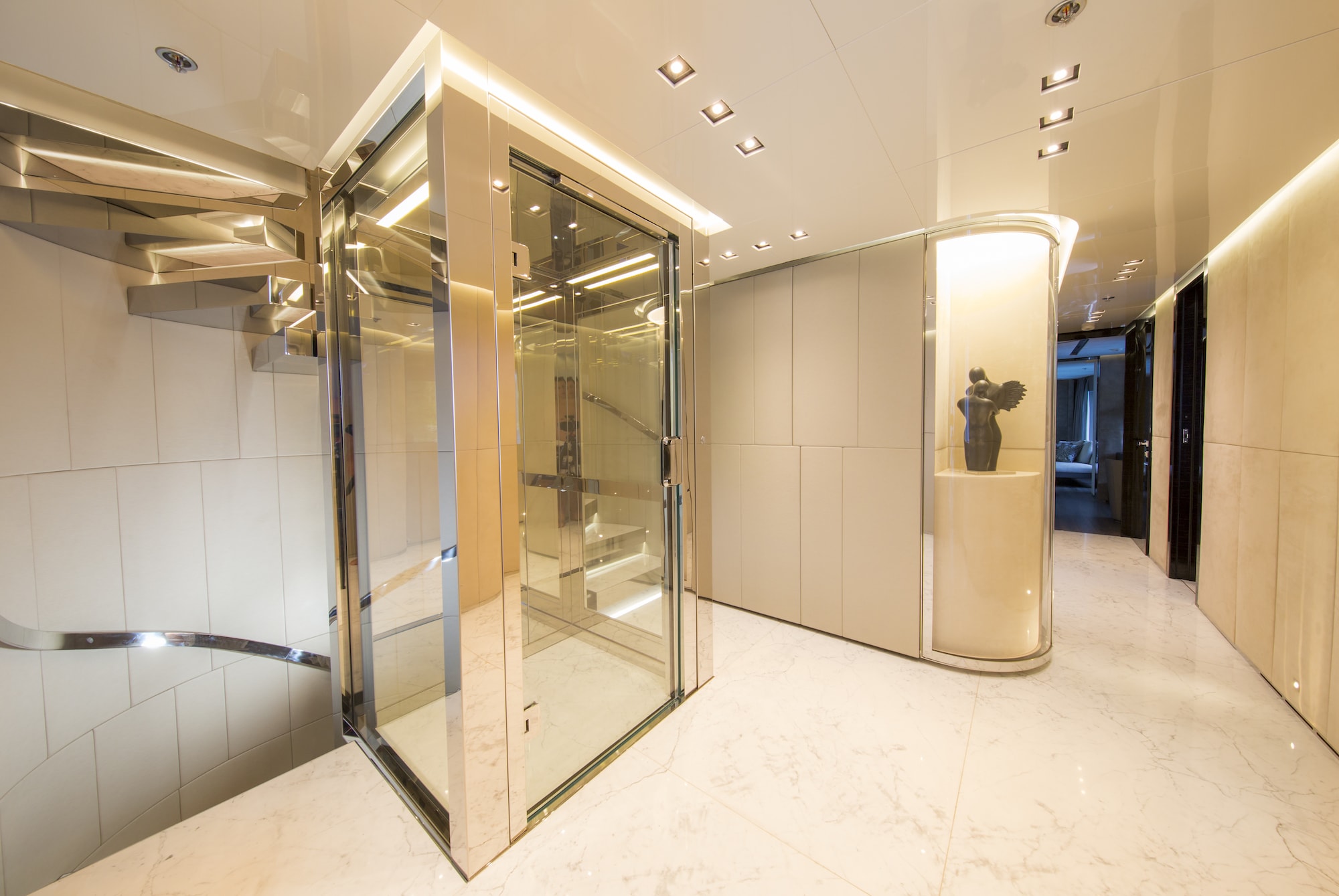 A foyer to starboard leads forward to a full beam master cabin and private study.