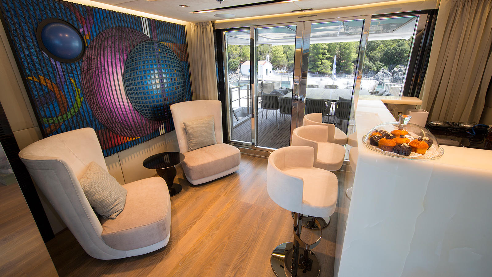 The main deck boasts the salon and formal dining, set in an open plan and surrounded by ample panoramic windows for optimum natural light. A foyer to starboard leads forward to a full beam master cabin and private study.