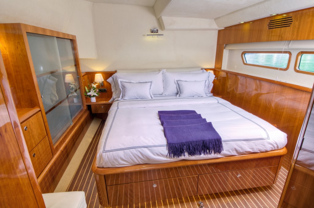 The interior décor is timeless and elegant, featuring neutral soft furnishings, high gloss panels and teak and holly inlaid floors throughout. The main salon is open and airy thanks to wrap around windows and wide sliding glass doors.