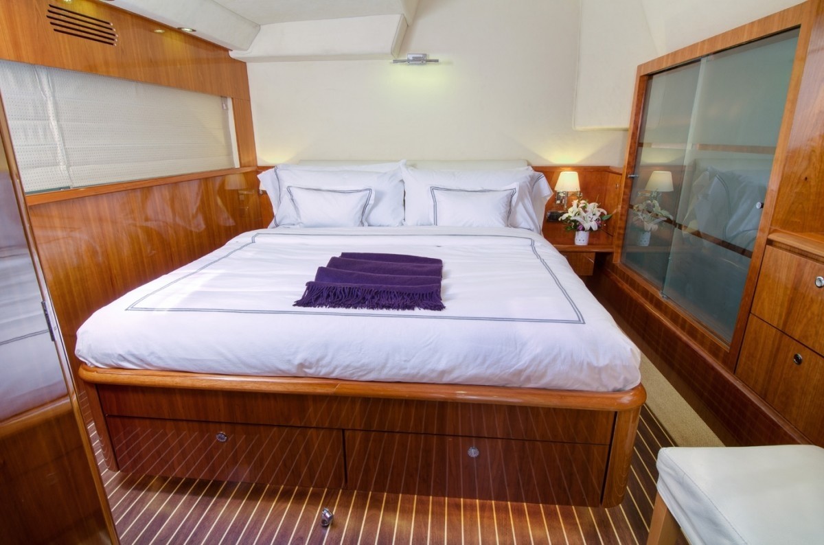 Forward in the salon is a generous leather seating area and formal dining table. Guest accommodation is in 4 double cabins, 1 master suite and 3 queen suites.