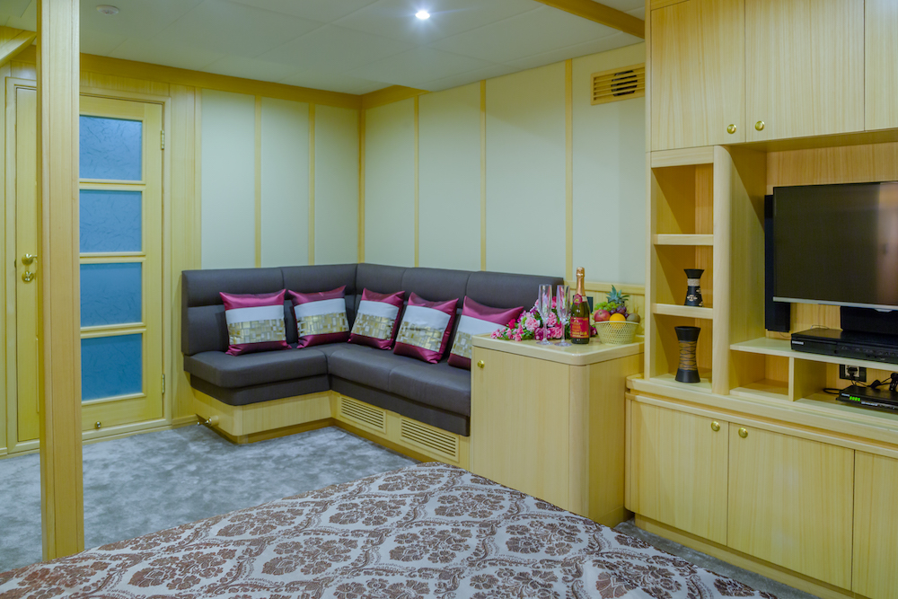 Two VIP guest Cabins: double bed with bedside tables and drawers below, wardrobe, drawer/cupboard storage, 32″ HD LED TV, radio/iPod, overhead and concealed 24v lighting with dimmer, bedside wall lights, inbuilt safe boxes, ...