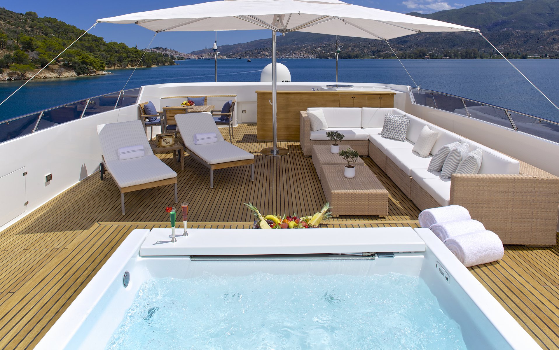 Spacious cabins of O'LEANNA can accommodate 12 guests in comfort. There are two master cabins: one on the upper deck and the other on the lower deck. There are also two double guest cabins and two twin cabins.