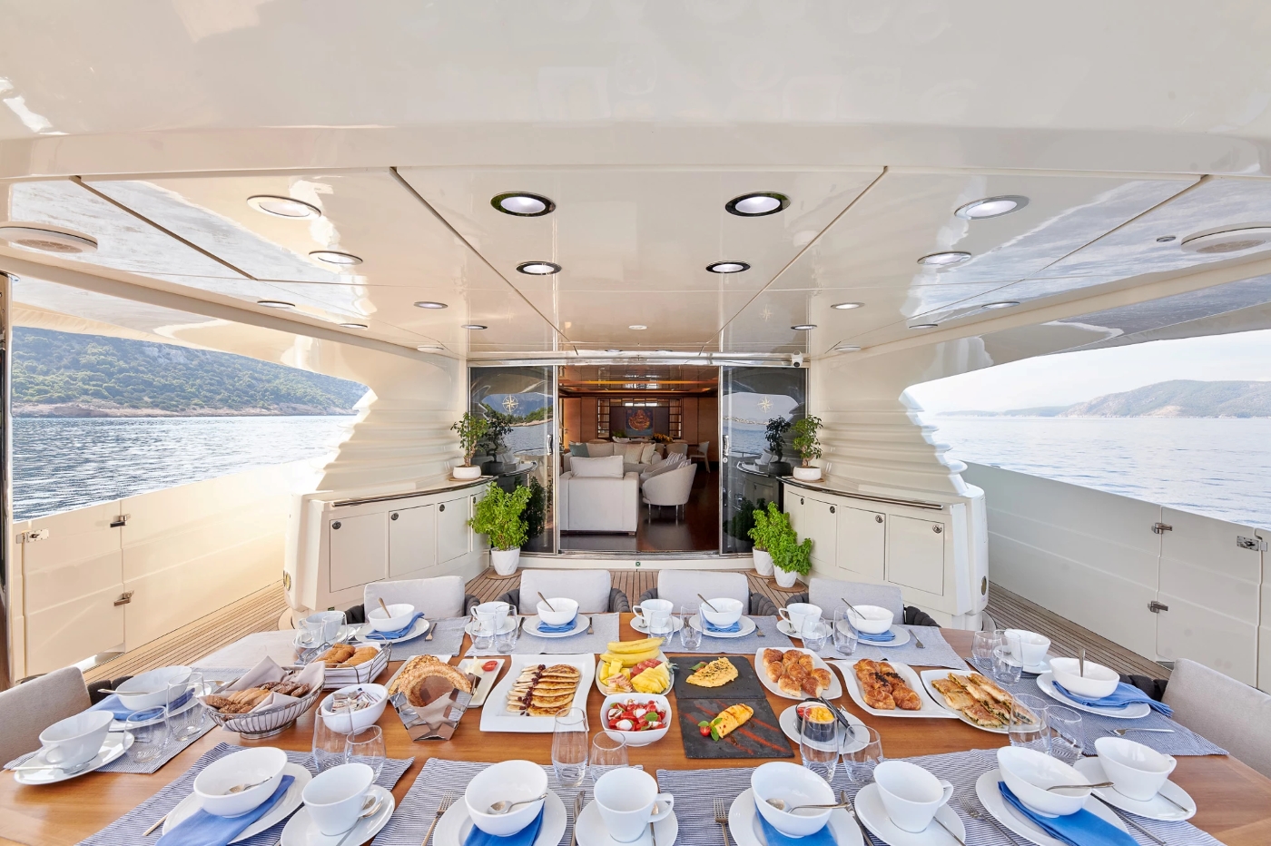 The shaded aft deck has direct access to the salon and has an alfresco dining table and seating. On the transom, the swim platform is transformed with an opening water toys garage, creating the perfect teak beach and water activity center.