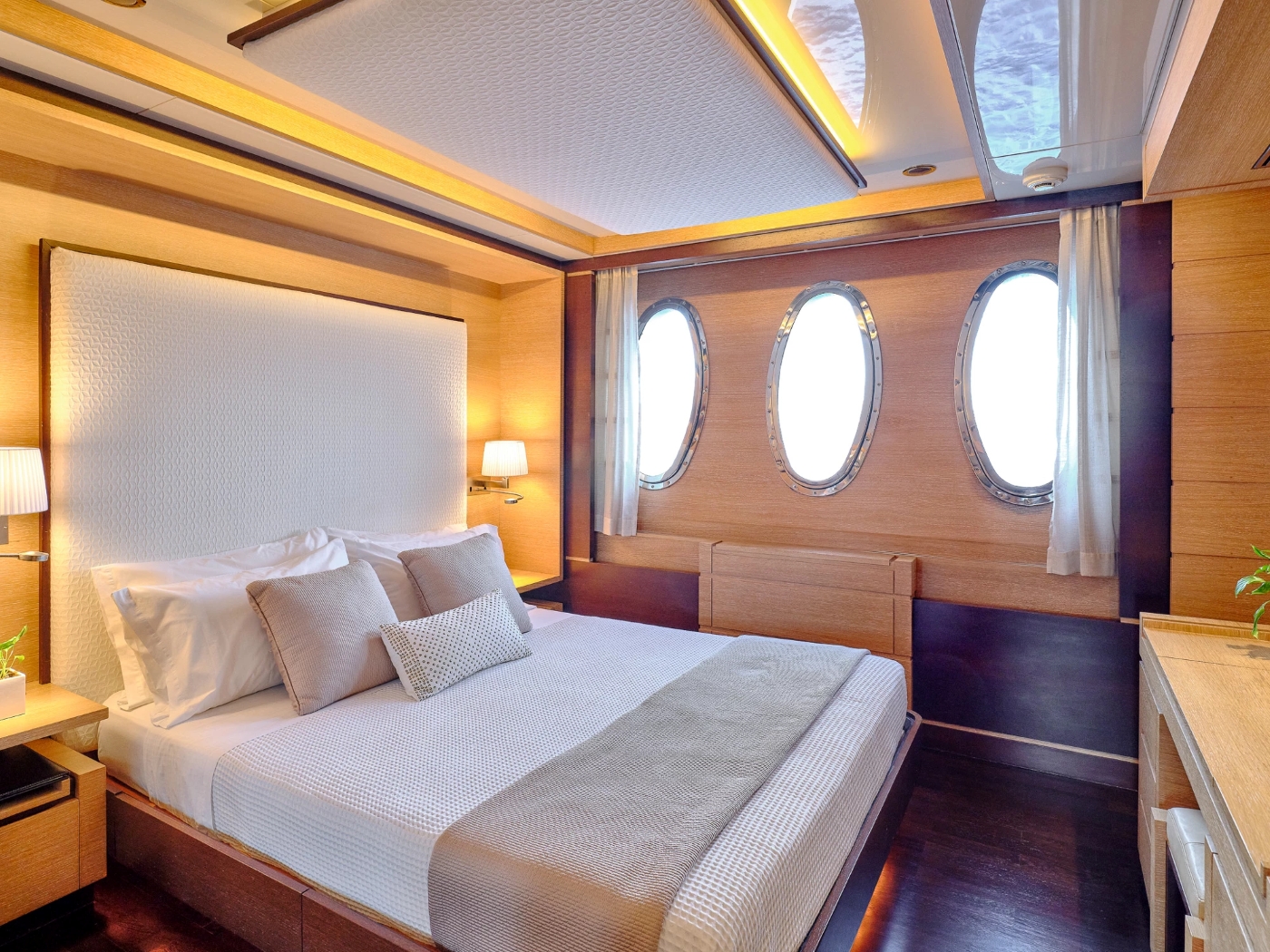 Aft of the salon are wide sliding glass doors leading to the shaded aft deck, while forward of the salon is a full-beam master stateroom, complete with 180° views. On the lower deck are additional guest cabins, each boasting private facilities.