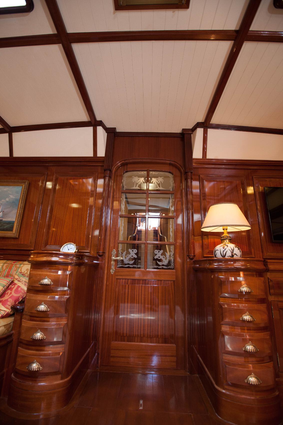The inteior decor features opulent mahogany and teak, as well as some beautiful elements of crystals and gold.