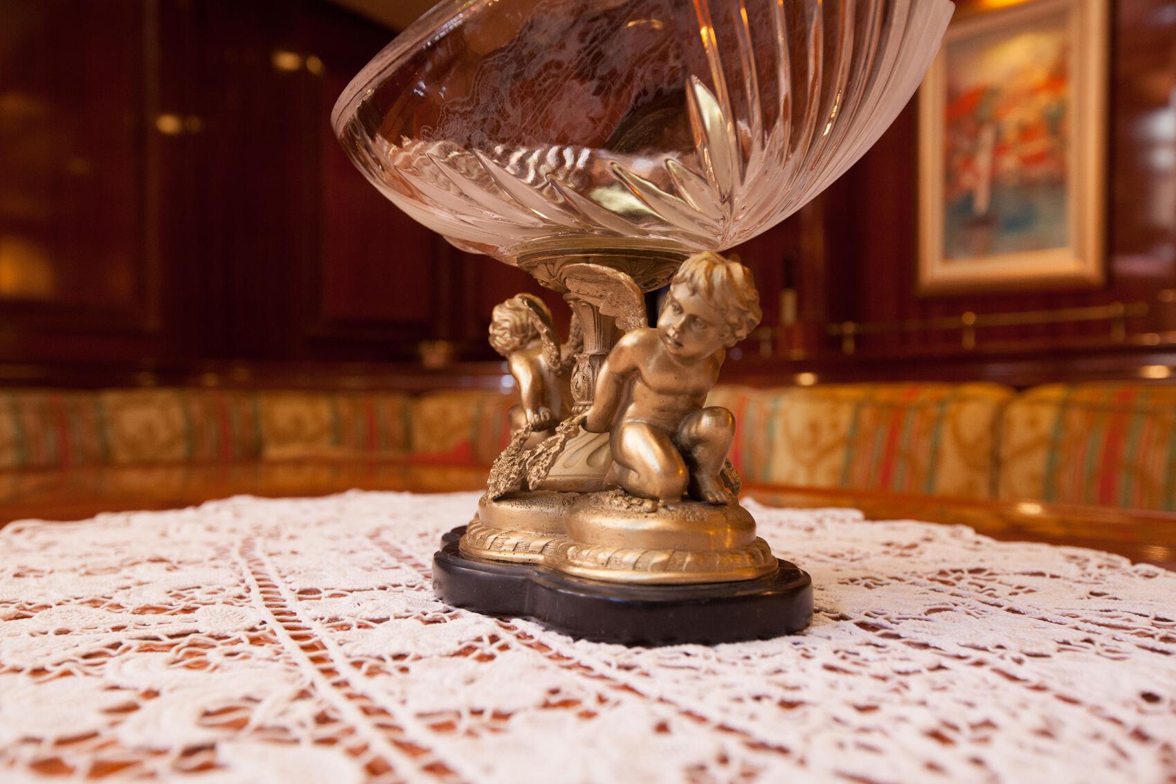 The inteior decor features opulent mahogany and teak, as well as some beautiful elements of crystals and gold.