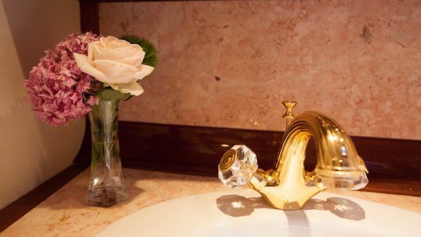 The inteior decor features opulent mahogany and teak, as well as some beautiful elements of crystals and gold.
