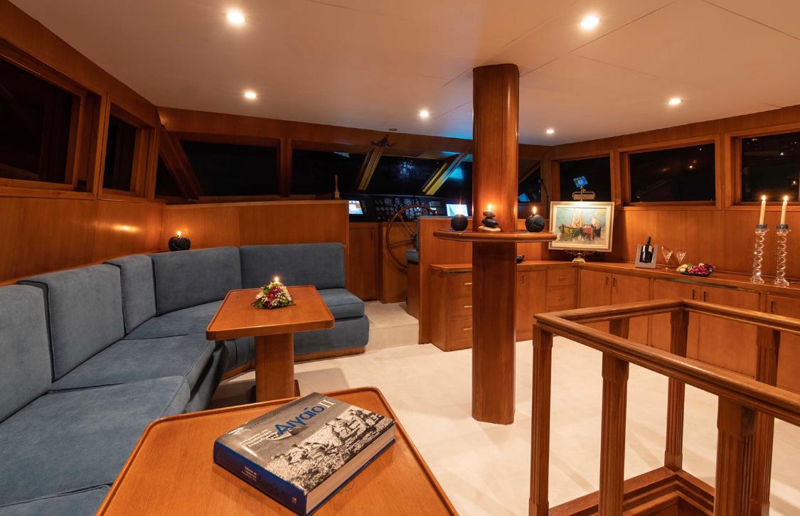 A smaller corner sofa and table is placed aft to starboard, and the rest of the space is beautifully furnished with cabinetry and timeless accessories that stand out against the warm wooden panelling.