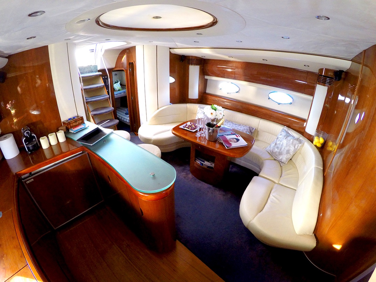 The yacht has a generous salon with open plan living, which includes a table and cocktail bar, ideal for entertaining with family and friends.