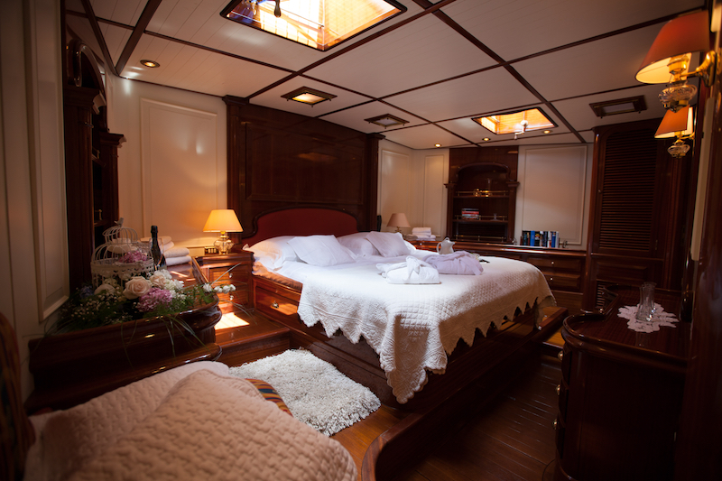 Accommodation on board HELIYACHTS 115' includes one master cabin, with en suite bathroom and large storage spaces. Furthermore two twin cabins, each with en suite bathroom and large storage spaces and one single cabin, with en suite bathroom.