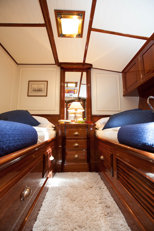 HELIYACHTS 115' provides accommodation in four lovely cabins with classic style, offering comfortable and welcoming overnight stay for up to seven charter guests. The accommodation layout is divided into one single cabin, one double cabin and two twin cabins. The yacht is services by a professional, friendly and trained crew of five.