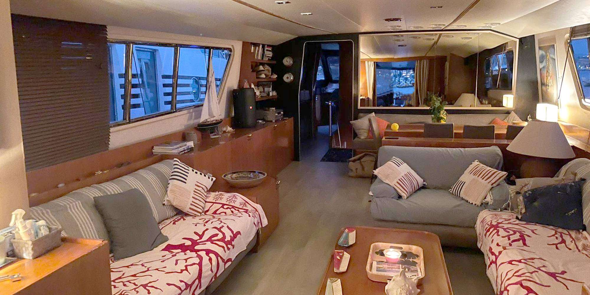The lower deck hosts the guest and crew accommodation. On the main deck, the helm station is forward and separated from the guest areas by a door.