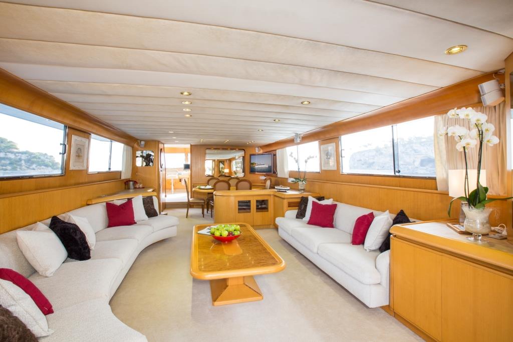 The main deck has a generous open plan salon and dining, with the lounge aft and formal dining forward. The décor is stylishly timeless, featuring honey toned woods and neutral soft furnishings. Panoramic windows ensure natural light and endless views.