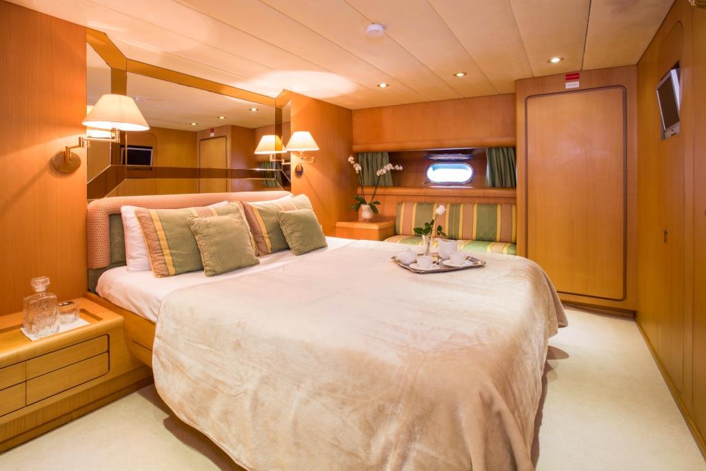 Her contemporary interiors are light and airy throughout. The main deck has a generous open plan salon and dining, with the lounge aft and formal dining forward. The décor is stylishly timeless, featuring honey toned woods and neutral soft furnishings.