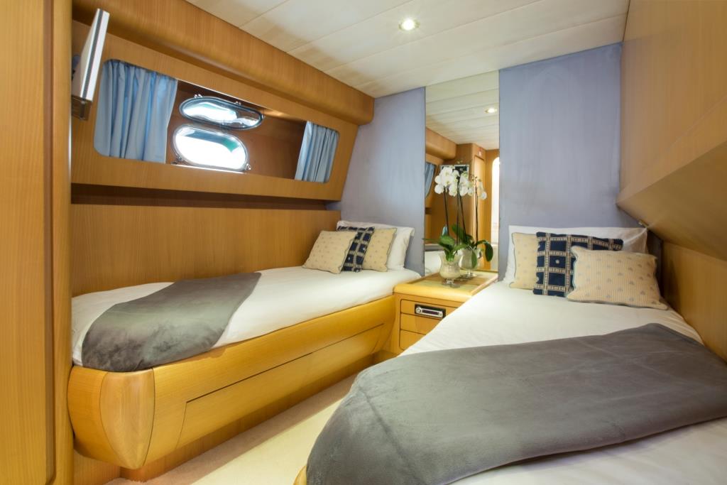 Her contemporary interiors are light and airy throughout. The main deck has a generous open plan salon and dining, with the lounge aft and formal dining forward. The décor is stylishly timeless, featuring honey toned woods and neutral soft furnishings.