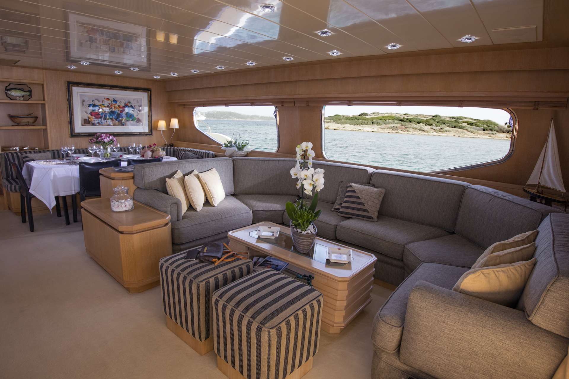 A staircase leads up to the main deck aft, where a plush sofa lines the stern and a raised table makes an ideal spot for alfresco dining or outdoor lounging sheltered by the flybridge overhang.