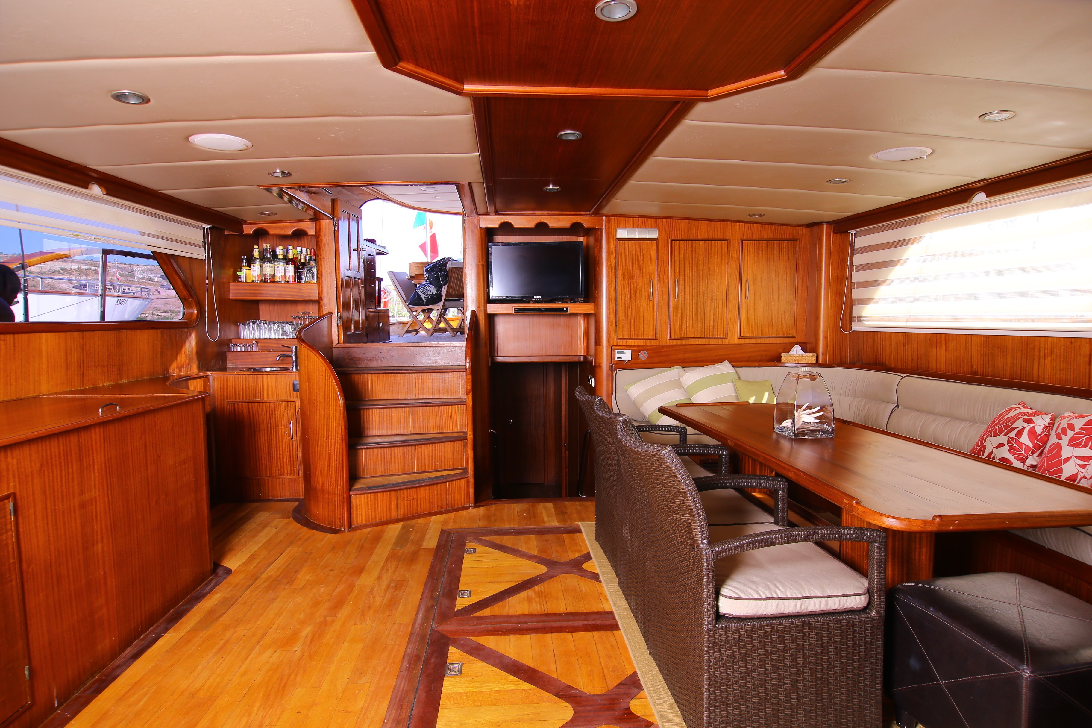 The salon and dining are laid to an open plan, offering a generous table to port and lounge on starboard. Surrounding windows provide ample natural light.