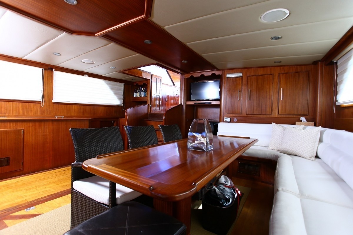The salon and dining are laid to an open plan, offering a generous table to port and lounge on starboard. Surrounding windows provide ample natural light.