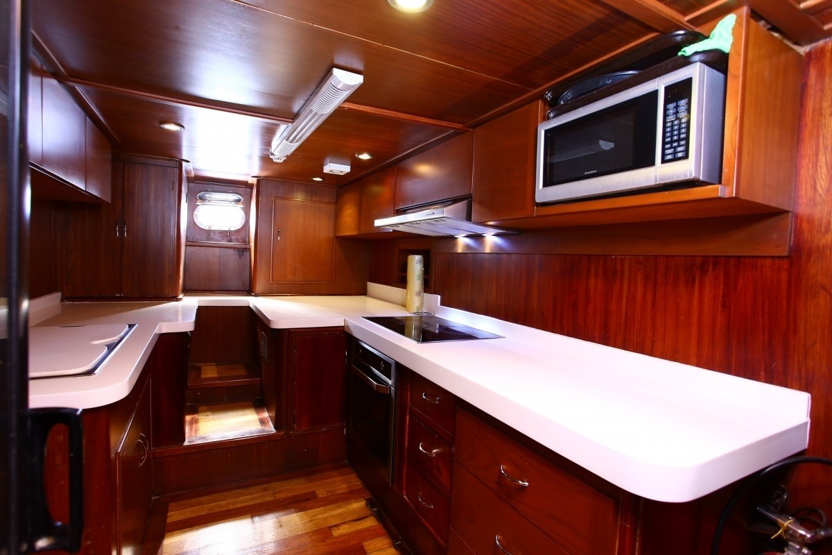 Accommodation is on the lower decks, comprising 2 full beam master staterooms, one aft and one forward. There are a further 2 double and 1 twin cabins, for up to 10 charter guests. Tenders & Toys