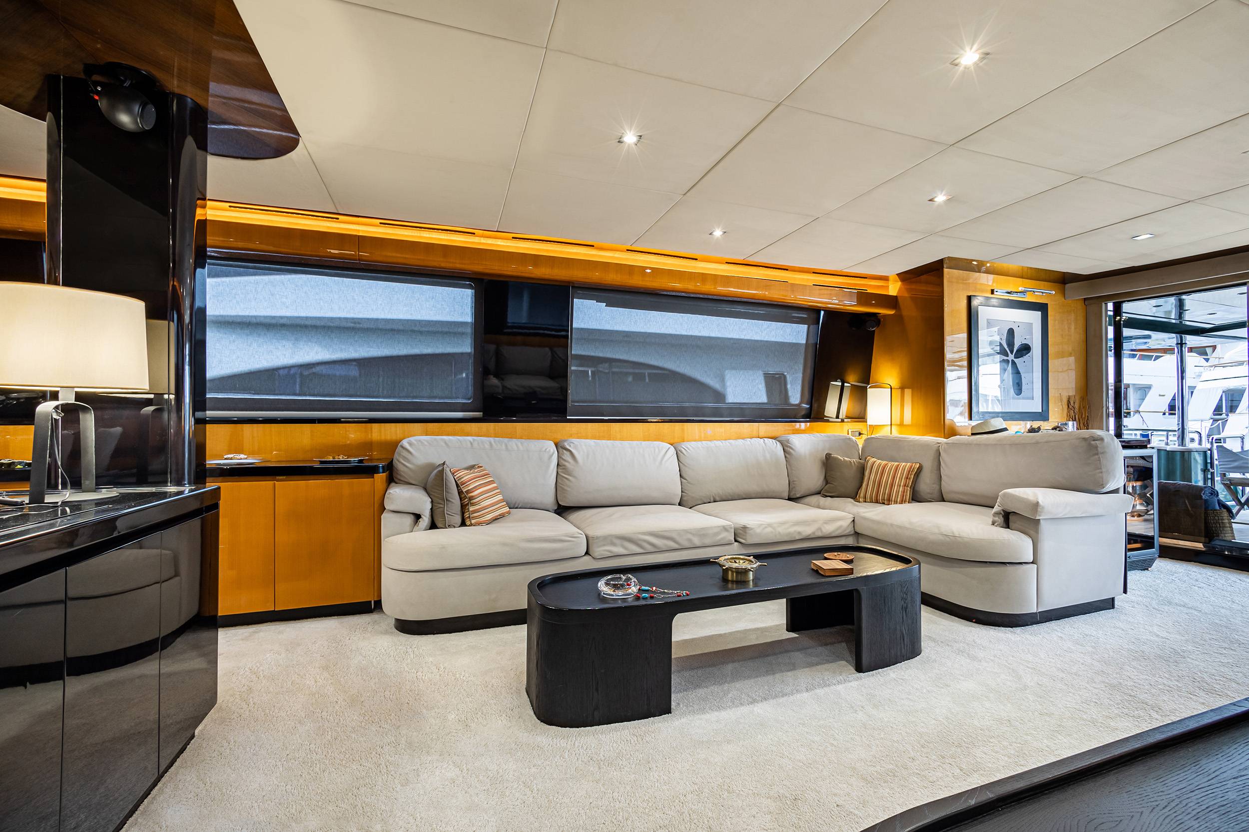 She is extremely modern with her main salon decorated in soft hues of grey and chic glossy black, that contrast nicely with the light wooden panelling. It boasts 2 L-shaped sofas around 2 coffee tables on both port and starboard side and opens on to a large formal dining room, with a round dining table forward.