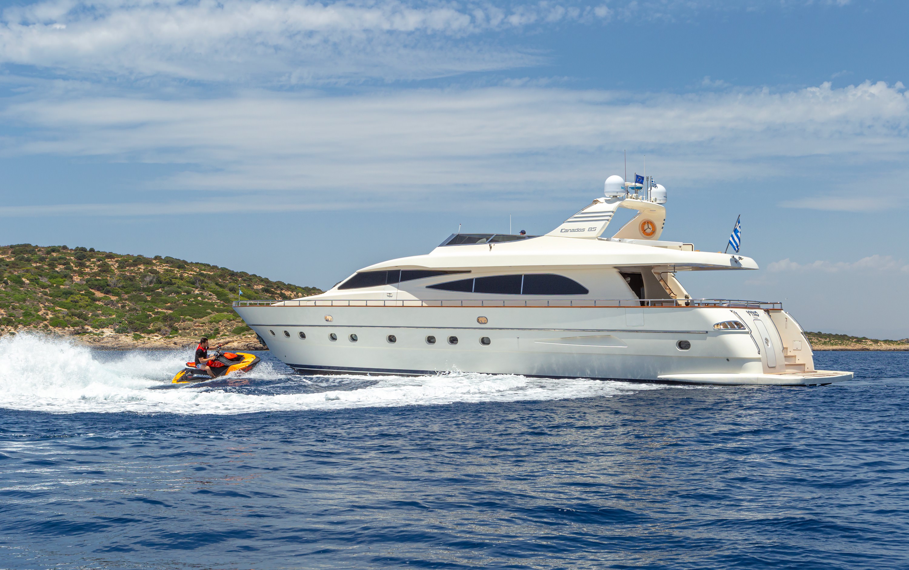 The yacht was built in 2003 by Canados and refitted in 2019, offering beautiful modern classic interiors with accommodation for up to 10 charter guests in 4 cabins.