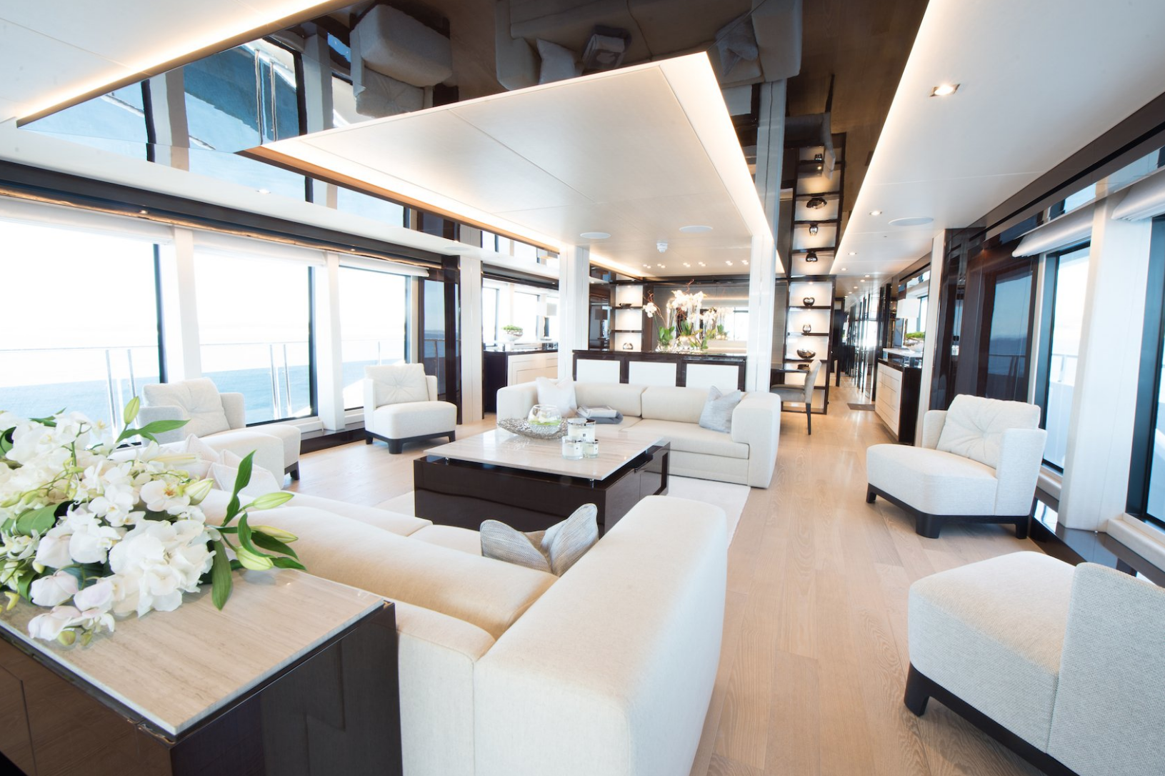 Offering two lounges, E-MOTION is was design with great socializing spaces in mind. There is a large seating area with a coffee table on the main deck. A formal dining area for ten guests is forward to the main salon. The sky lounge is on the upper deck and features an ample seating area and a TV set.