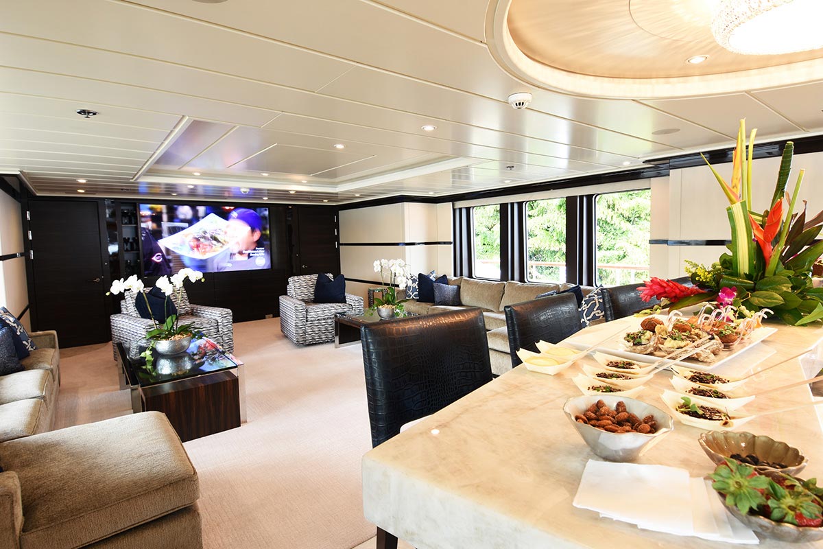 Superyacht NITA K II has a beautiful Main Salon with an adjacent formal dining area for 12 guests. The main Salon features 2 oversized sofas and two chairs as well as a popup 42 inch TV with surround sound.