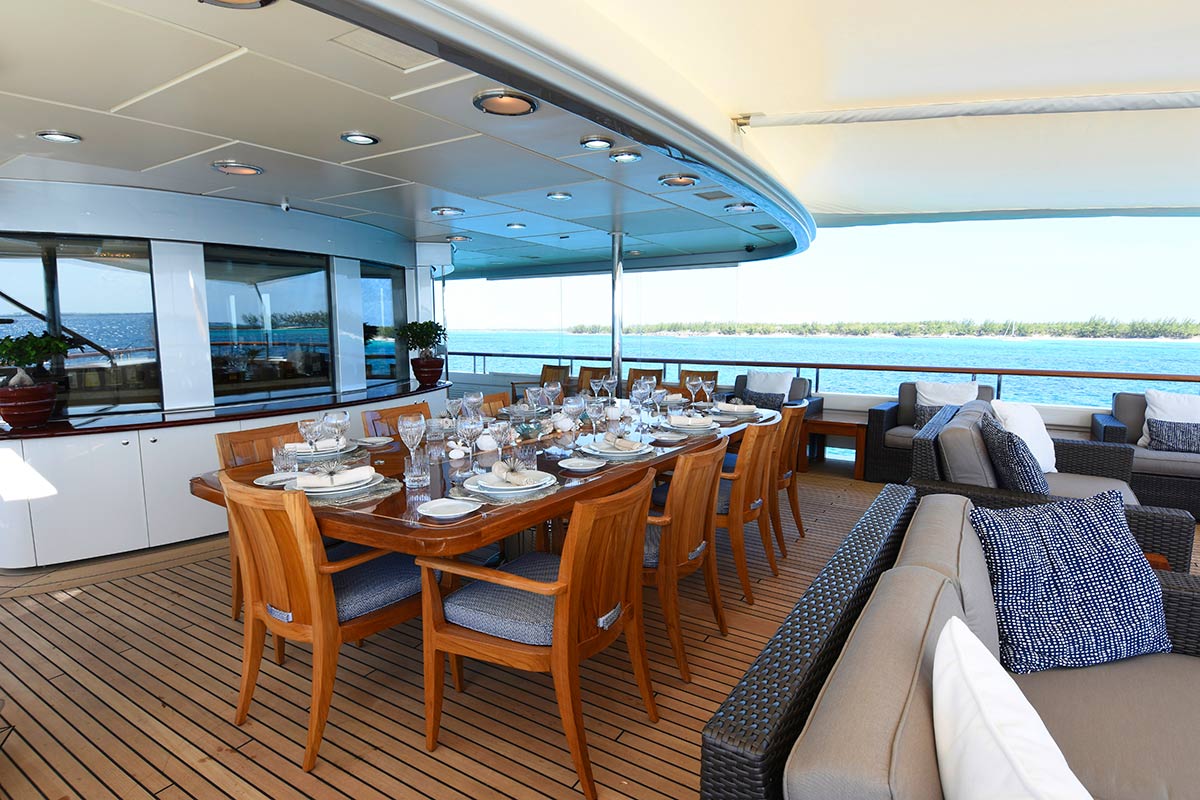 Superyacht NITA K II has a beautiful Main Salon with an adjacent formal dining area for 12 guests. The main Salon features 2 oversized sofas and two chairs as well as a popup 42 inch TV with surround sound.