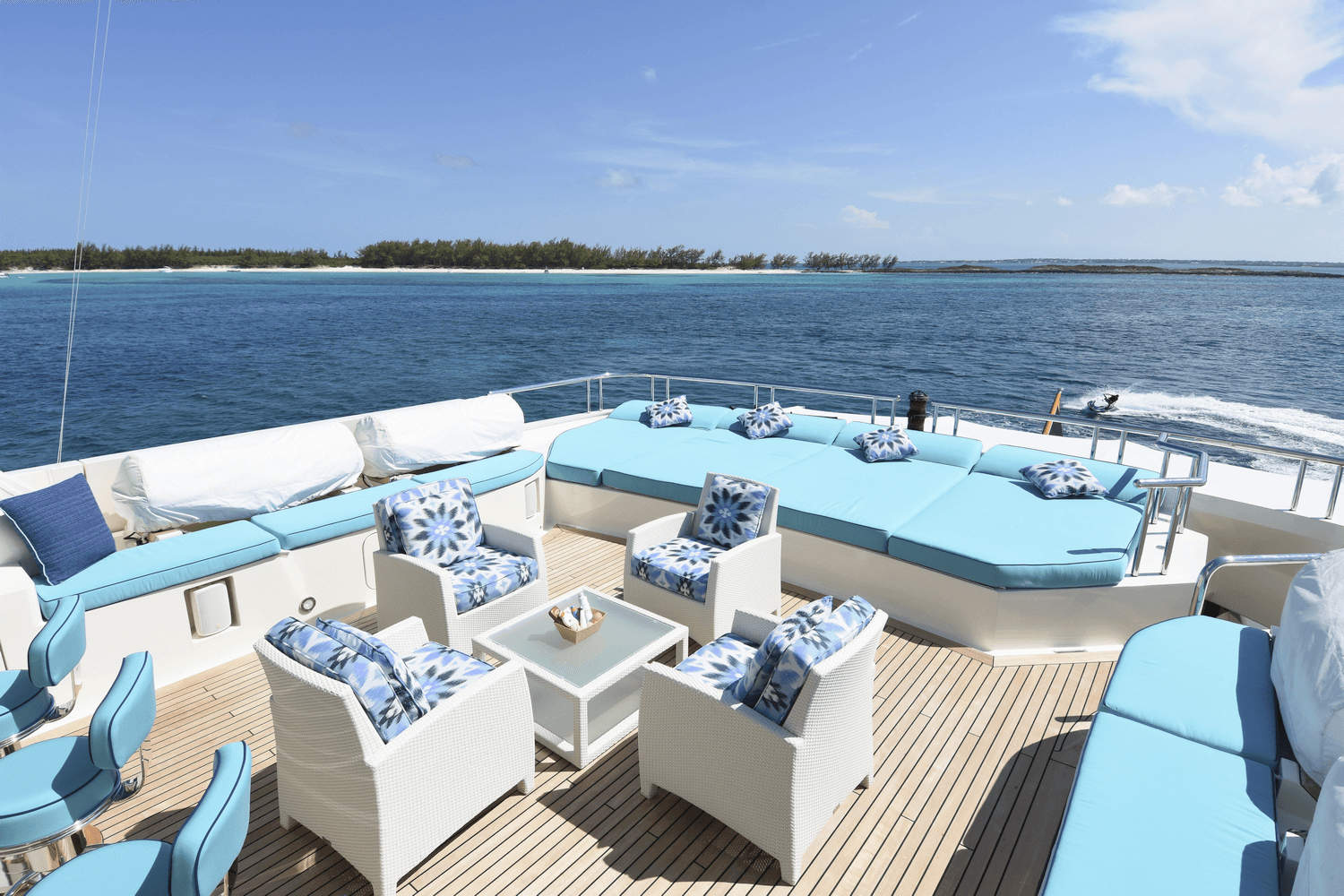 Forward is the Jacuzzi area with Sunpads either side of the Jacuzzi. The middle of the Sundeck is the bar area with seating for 8 people at the bar. The Aft of the sundeck is a table and more sunpads.