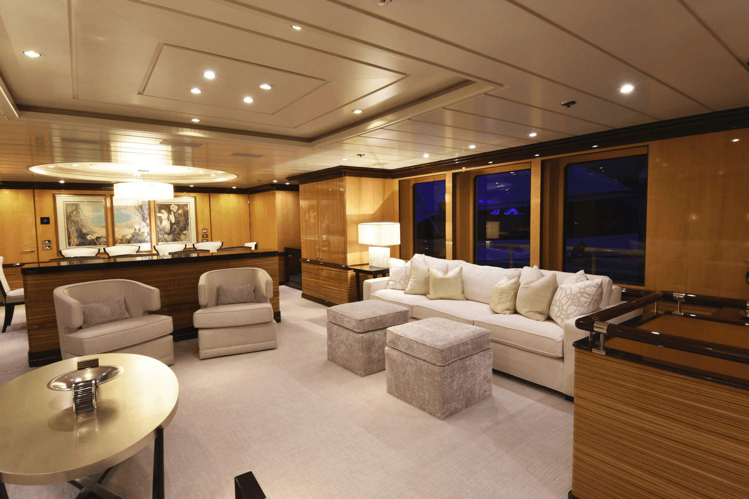 Superyacht NITA K II has a beautiful Main Salon with an adjacent formal dining area for 12 guests. The main Salon features 2 oversized sofas and two chairs as well as a popup 42 inch TV with surround sound.