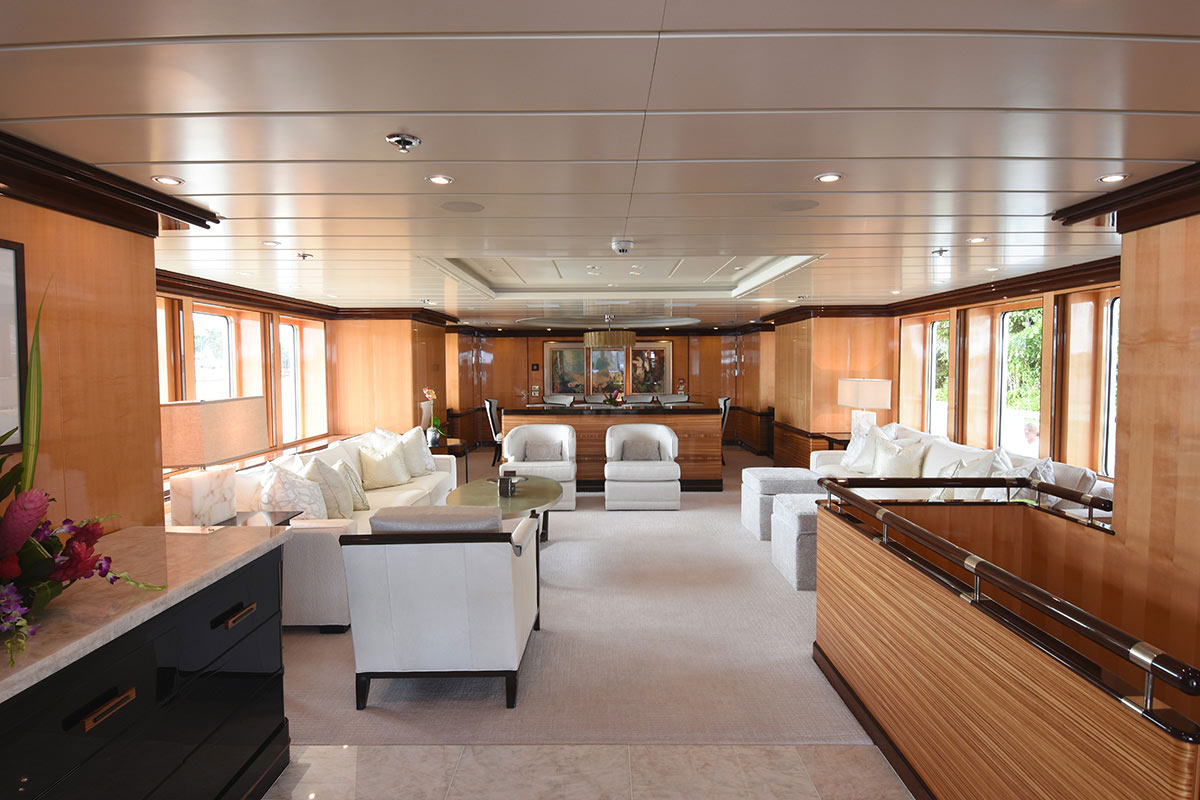 Superyacht NITA K II has a beautiful Main Salon with an adjacent formal dining area for 12 guests. The main Salon features 2 oversized sofas and two chairs as well as a popup 42 inch TV with surround sound.