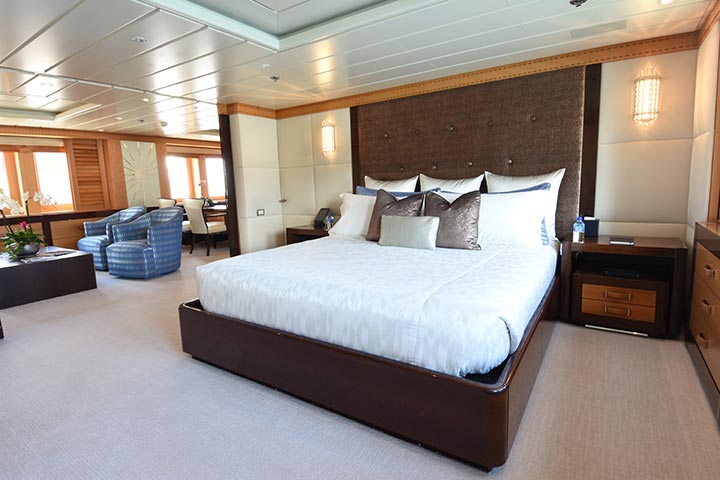 The bed area can be completely closed off from the lounge area for 100% privacy There are two guests cabins located below deck to port with a Queen sized bed, an ensuite bathroom with tub & shower and a 42 inch TV.. A further two Guest cabins below decks to starboard have a Queen sized bed, an ensuite with shower and a 42inch TV.