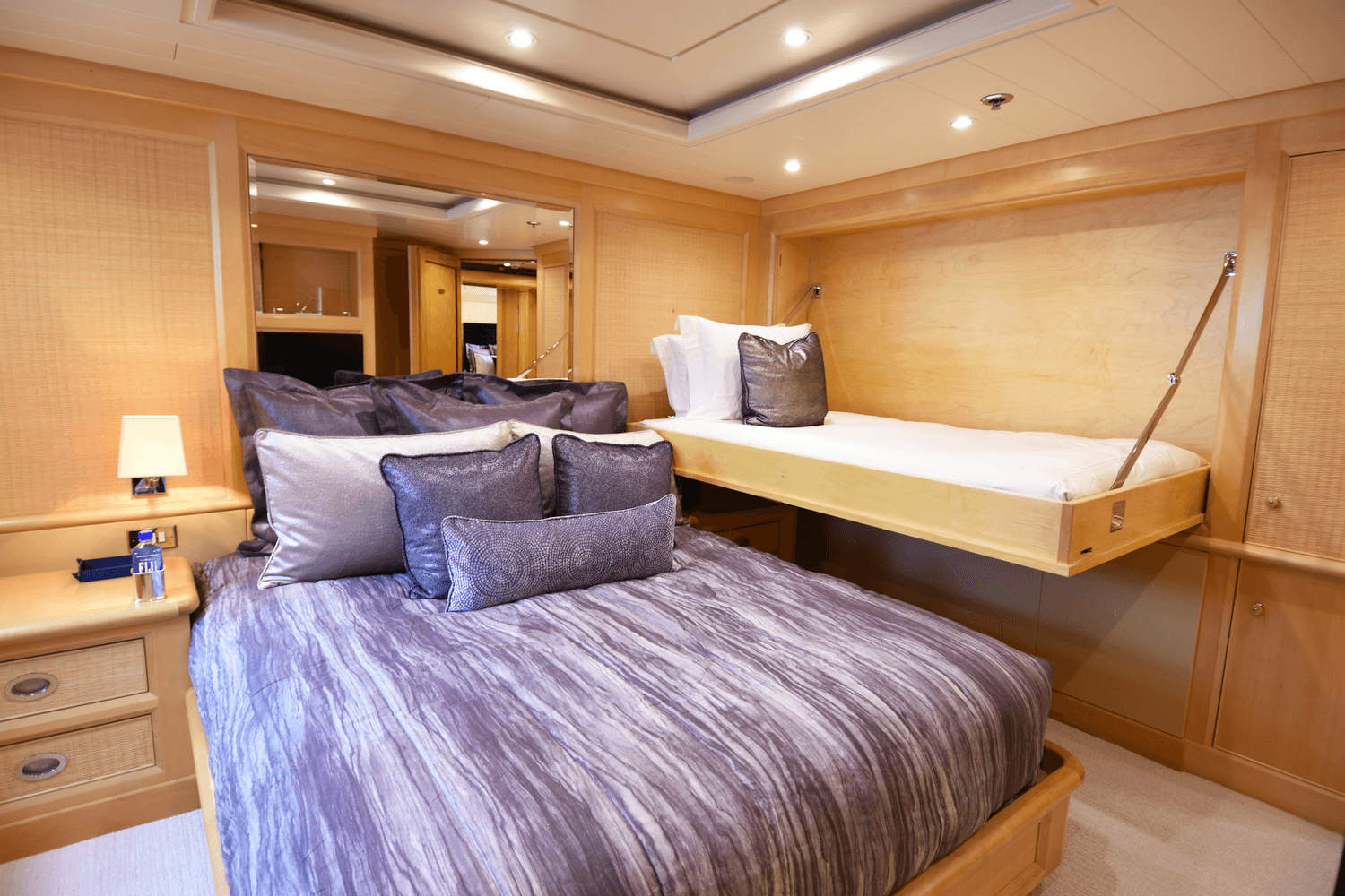 The bed area can be completely closed off from the lounge area for 100% privacy There are two guests cabins located below deck to port with a Queen sized bed, an ensuite bathroom with tub & shower and a 42 inch TV.. A further two Guest cabins below decks to starboard have a Queen sized bed, an ensuite with shower and a 42inch TV.