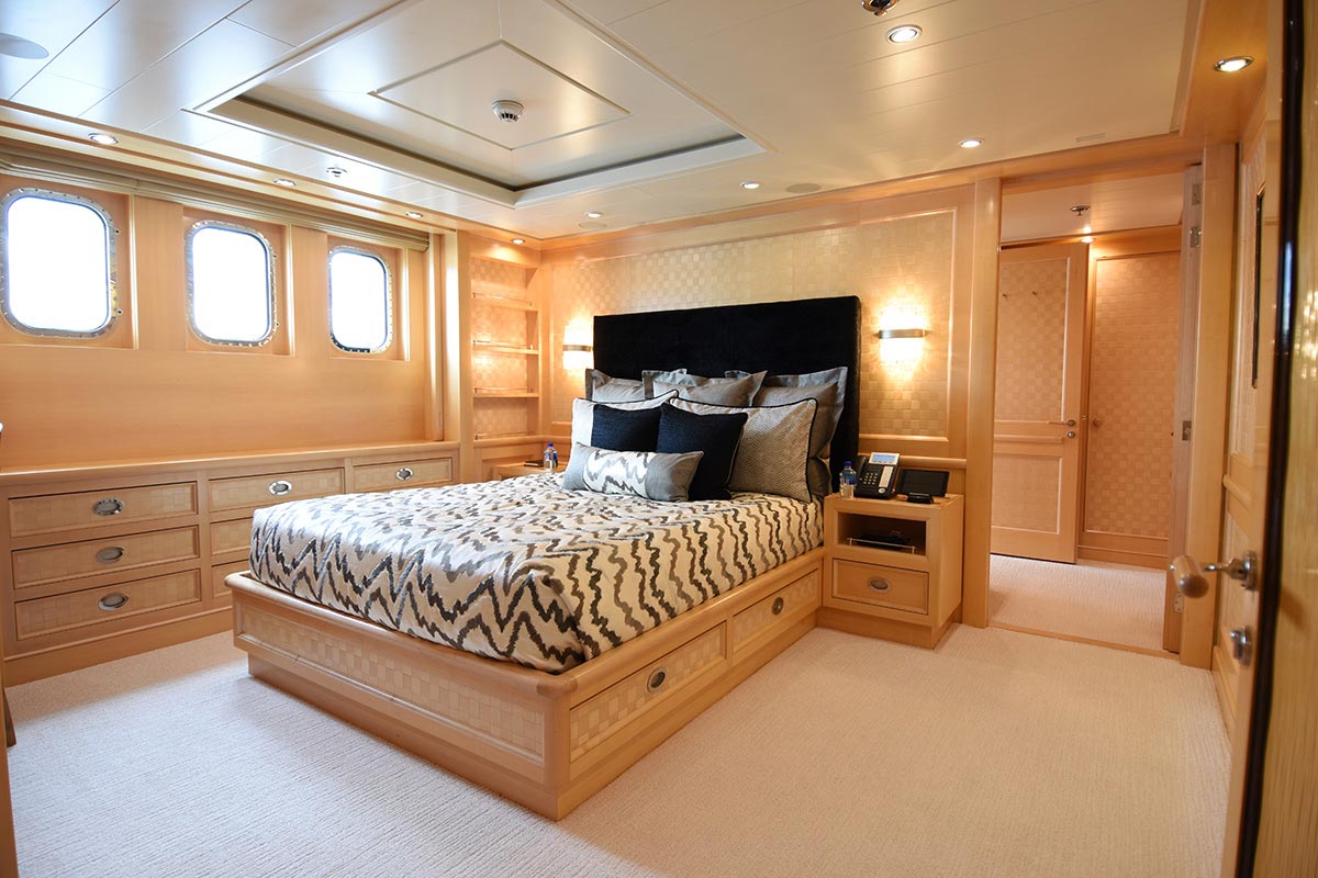 The bed area can be completely closed off from the lounge area for 100% privacy There are two guests cabins located below deck to port with a Queen sized bed, an ensuite bathroom with tub & shower and a 42 inch TV.. A further two Guest cabins below decks to starboard have a Queen sized bed, an ensuite with shower and a 42inch TV.