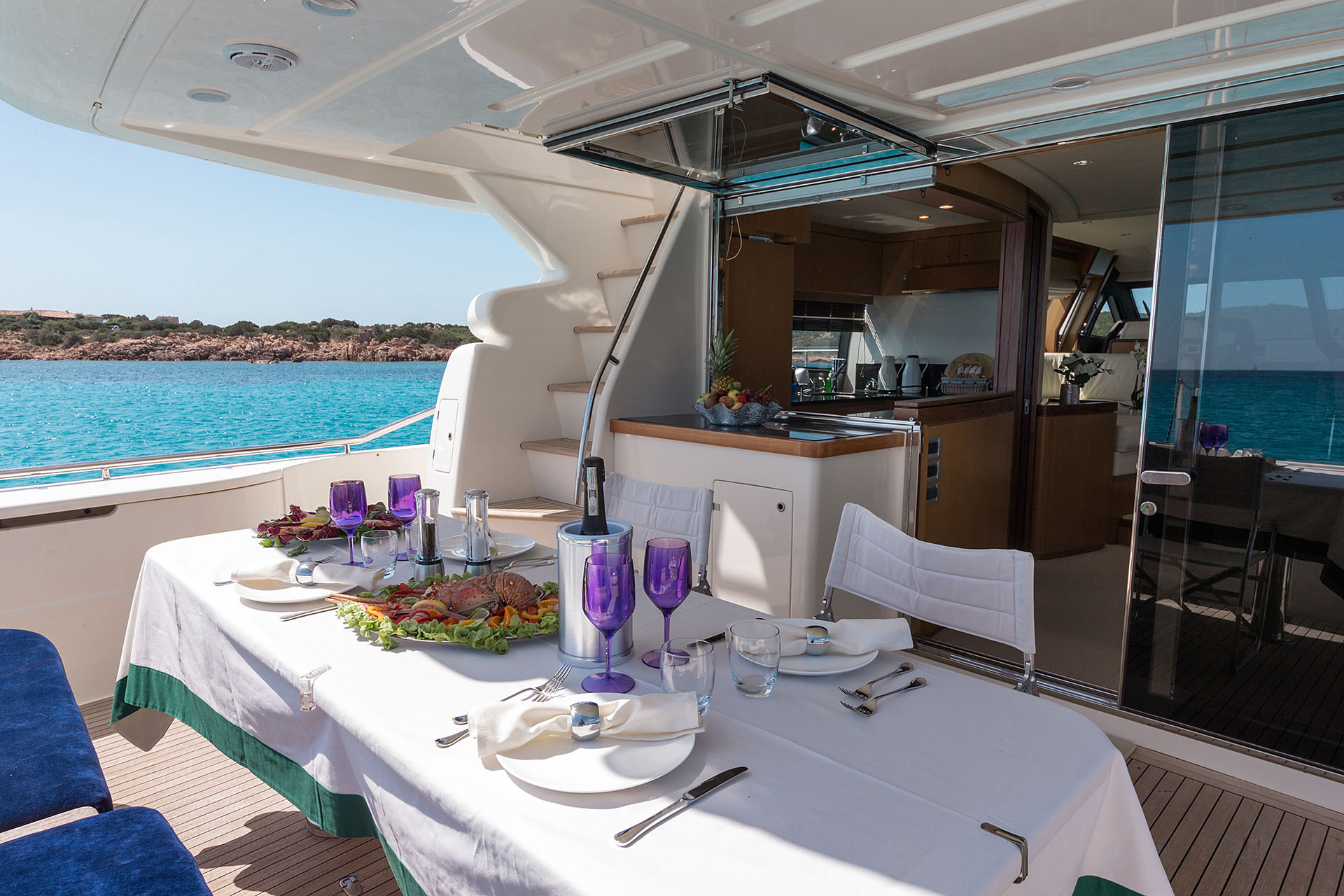 Her interiors are light and airy thanks to well-appointed windows and ports. The contemporary salon and dining space feature supple leather sofas, coffee table and entertainment.