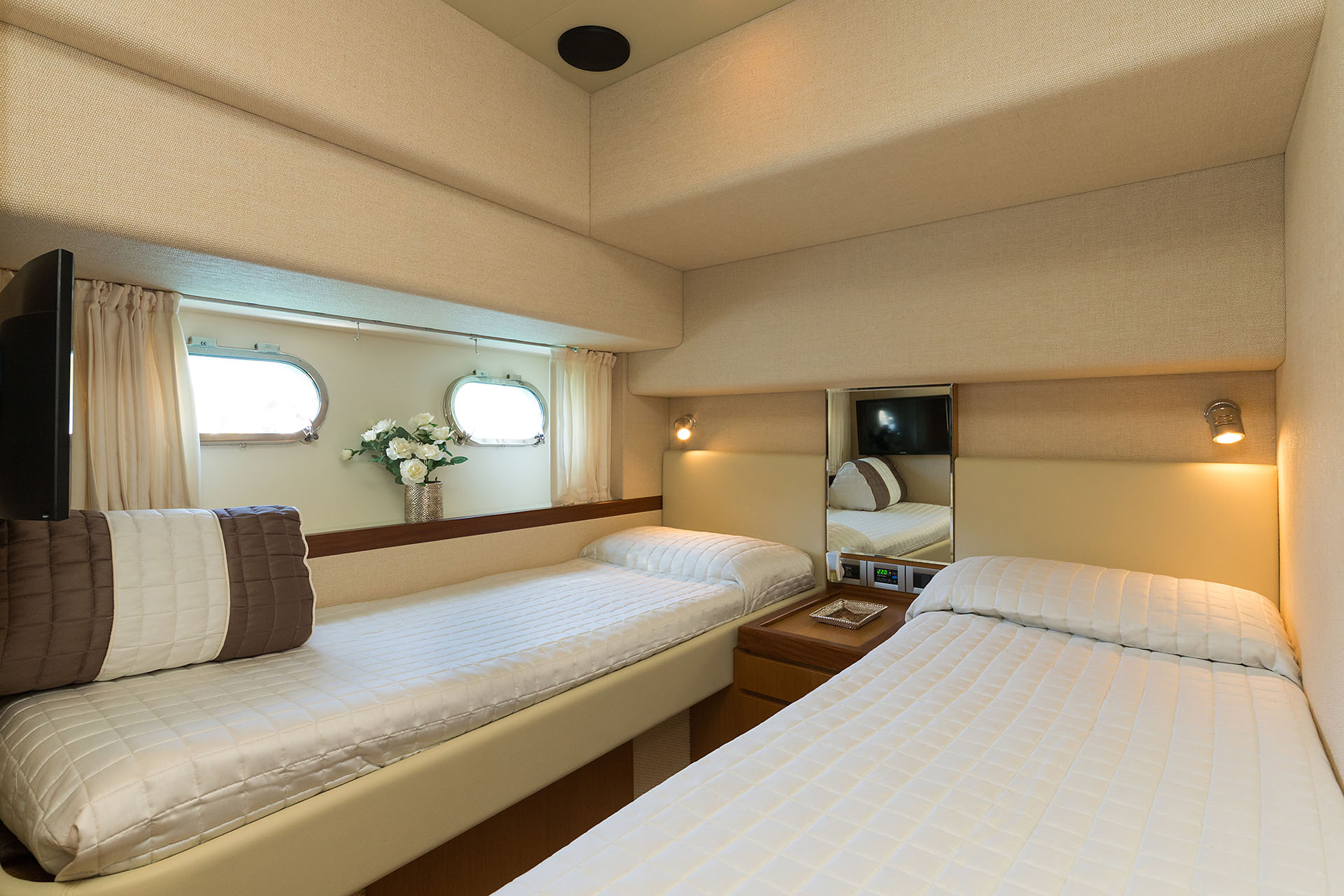 Her interiors are light and airy thanks to well-appointed windows and ports. The contemporary salon and dining space feature supple leather sofas, coffee table and entertainment.