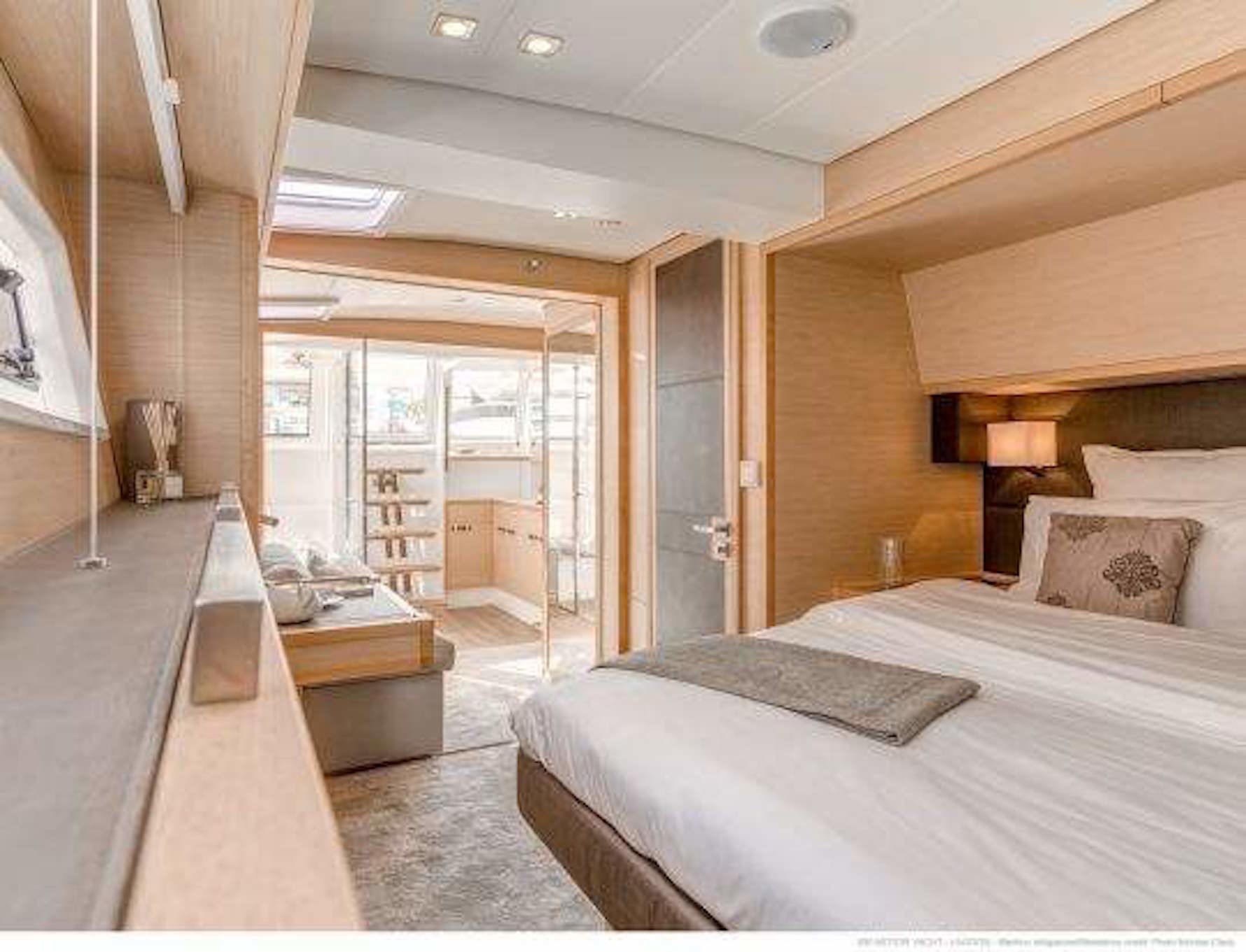 Stairs lead down each hull for easy access to the water, and the swim platform that stores the tender while cruising allows hydraulically lifts for convenience. The staircase leads up to the flybridge, where guests have an abundance of seating beneath the canvas bimini for relaxation and taking in the views.