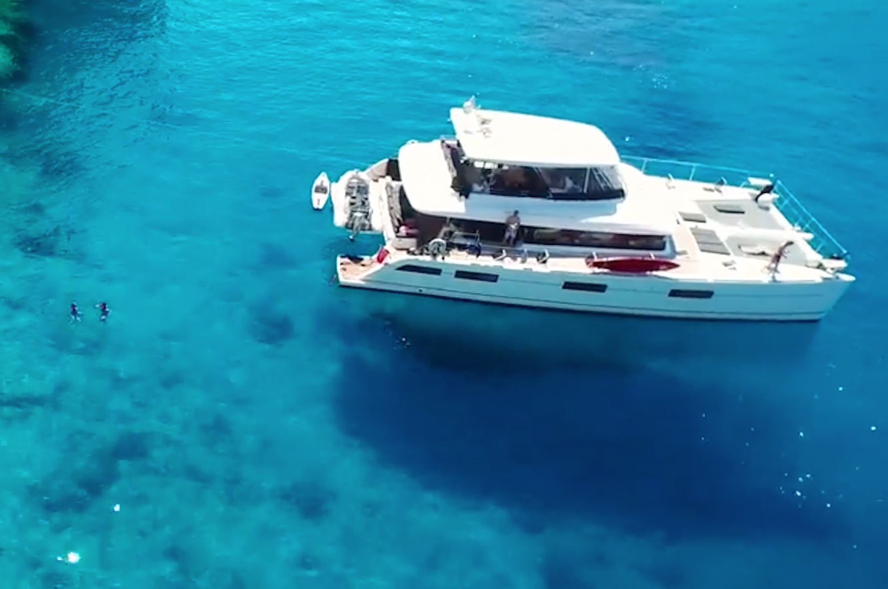 Stairs lead down each hull for easy access to the water, and the swim platform that stores the tender while cruising allows hydraulically lifts for convenience. The staircase leads up to the flybridge, where guests have an abundance of seating beneath the canvas bimini for relaxation and taking in the views.