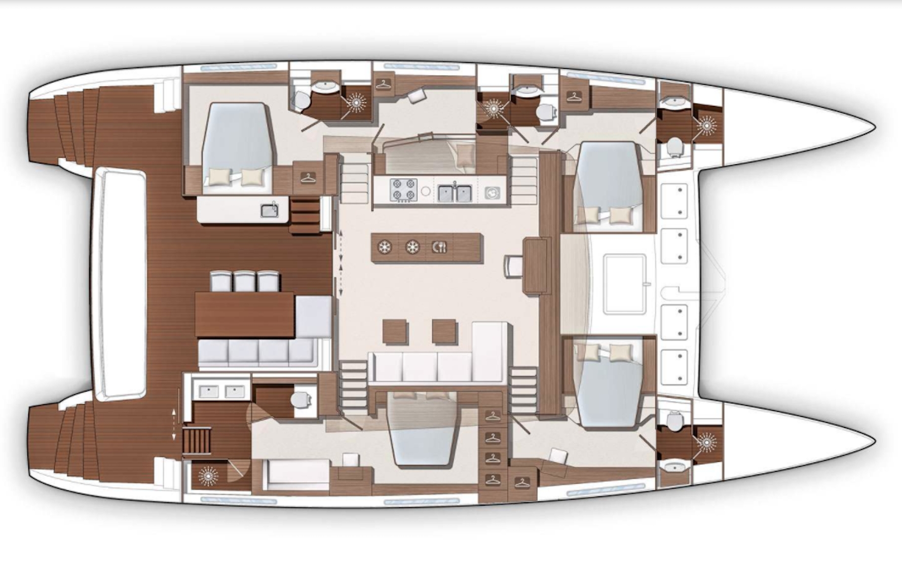 Stairs lead down each hull for easy access to the water, and the swim platform that stores the tender while cruising allows hydraulically lifts for convenience. The staircase leads up to the flybridge, where guests have an abundance of seating beneath the canvas bimini for relaxation and taking in the views.