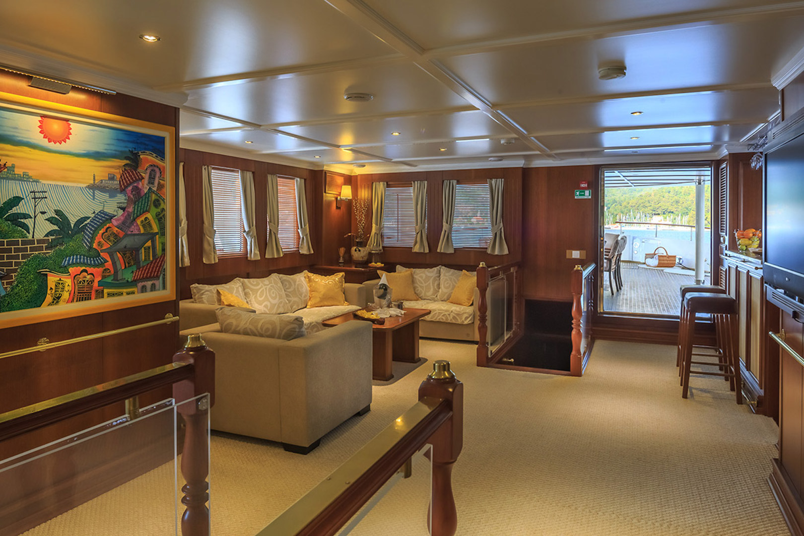 All the cabins comprise their own full bathroom, TV, and Hi-Fi. The master suite, located on the upper deck, boasts a King Size bed, two sofas around a coffee table, a desk, a closet, and a safe. It also includes a vast 43m2 private office.