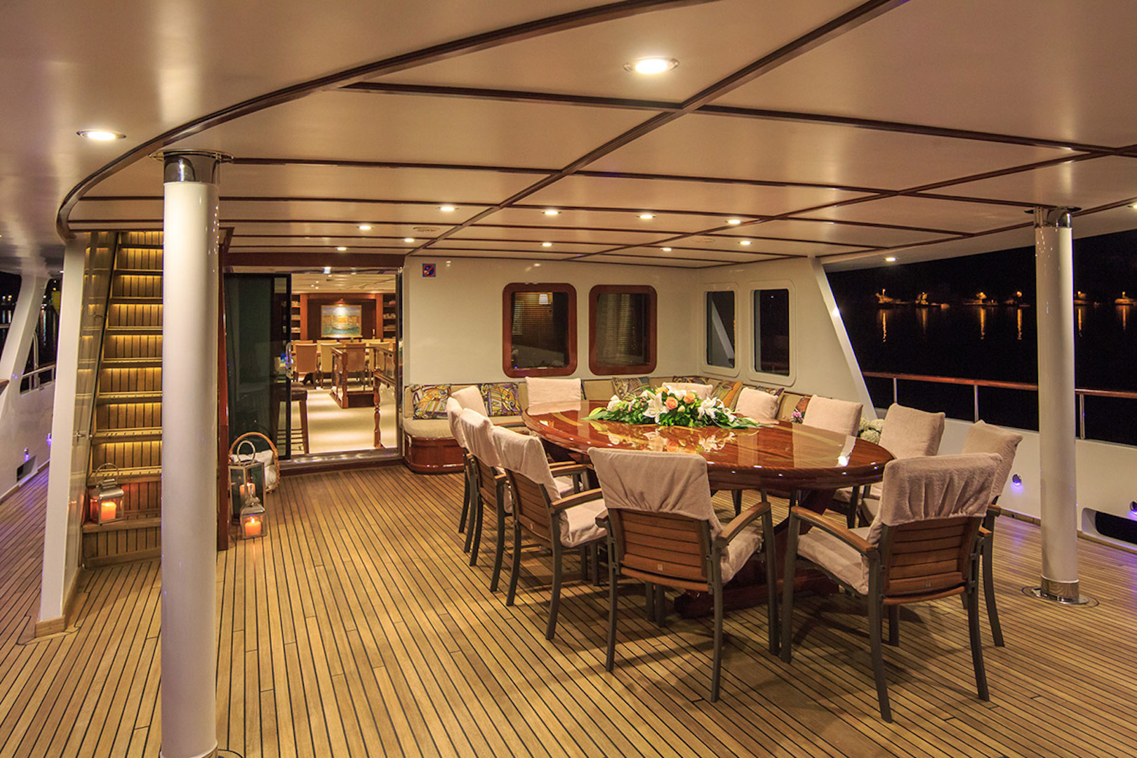 She is a full displacement yacht and has a Steel superstructure and stabilizers both at anchor and underway for maximum comfort. All the cabins comprise their own full bathroom, TV, and Hi-Fi. The master suite, located on the upper deck, boasts a King Size bed, two sofas around a coffee table, a desk, a closet, and a safe.
