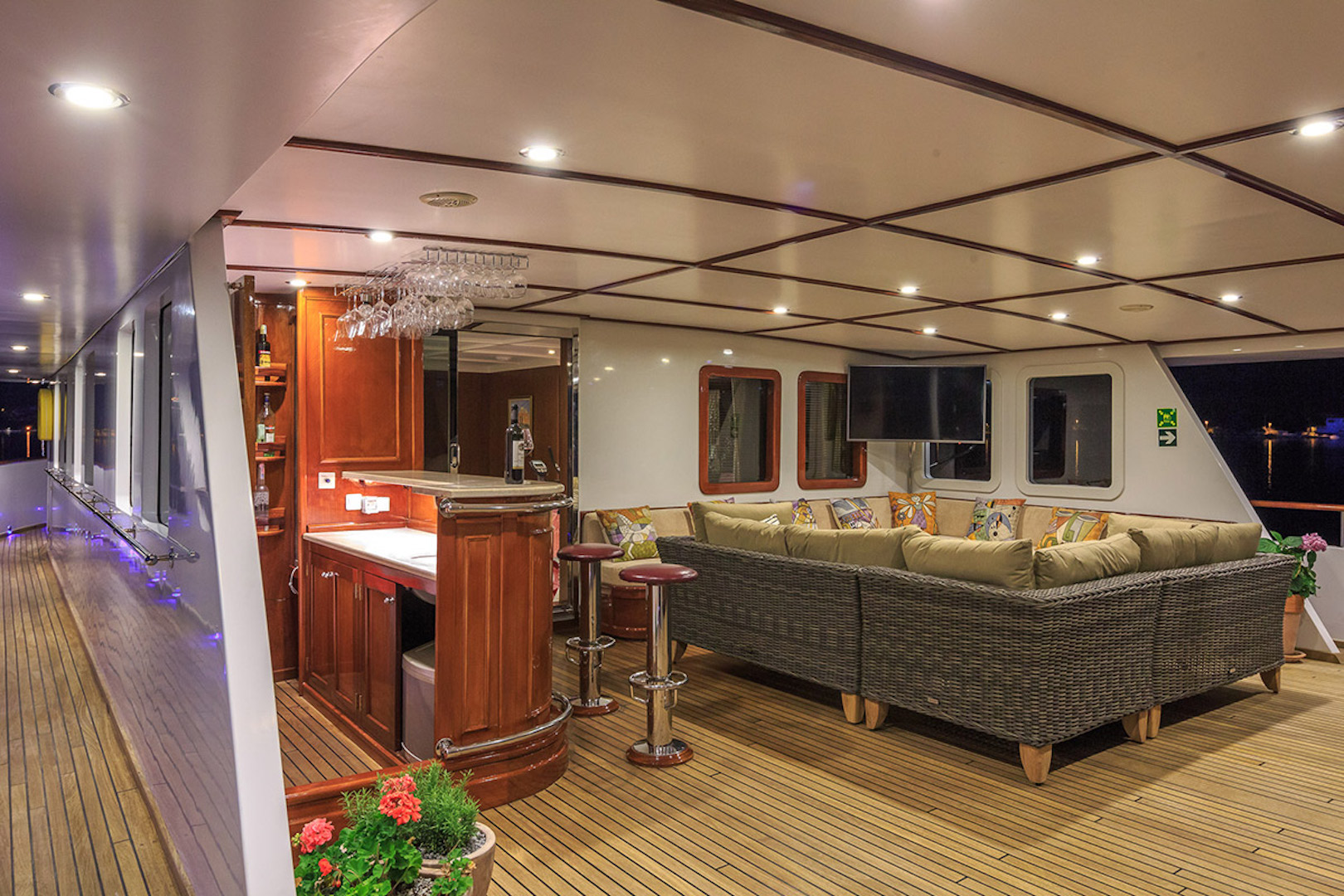 The salon area boasts colorful plush seating to starboard around a wooden coffee table, which faces the TV and one of the latest video-audio systems. Guests can then access six double cabins through a central staircase down to the lower deck, or head forward to the formal dining area.