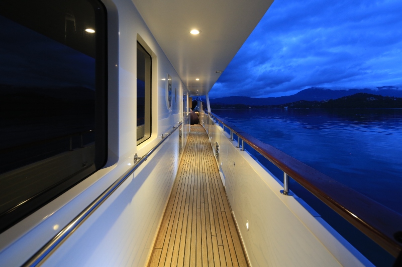 The shaded main deck aft is quite impressive and allows guests to sit back and enjoy aperitifs, or dine al fresco around a large table with chairs. The upper deck aft has a double canopy bed, generous sofas around an L shape table, as well as a nice corner bar with stools, ideal for socializing.
