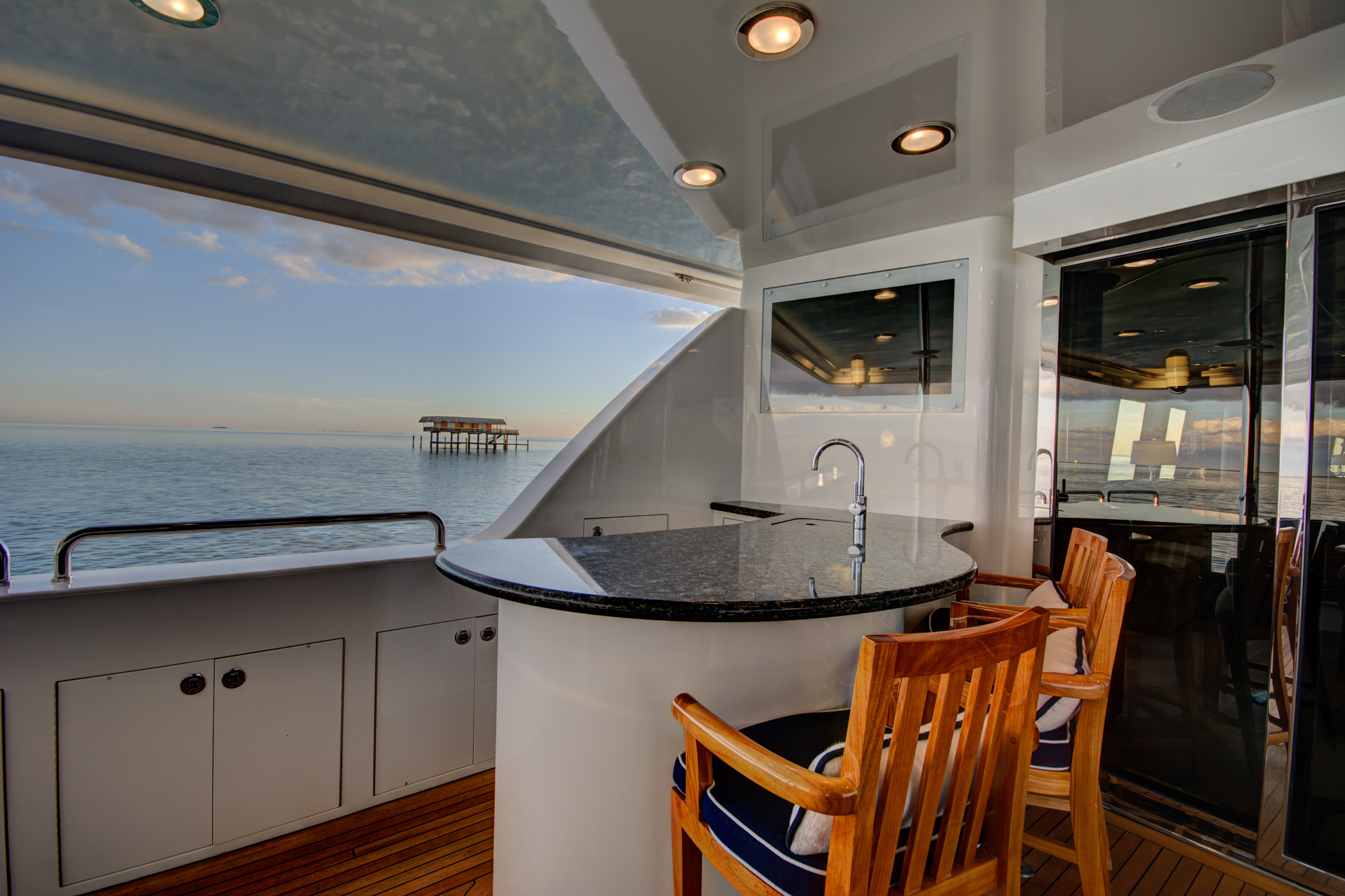 Exterior living aboard the yacht MY MAGGIE is laid out over 2 levels and very voluminous. The aft deck has direct access to the salon thorough sliding glass doors and offers an alfresco dining option, soft seating and a wet bar.