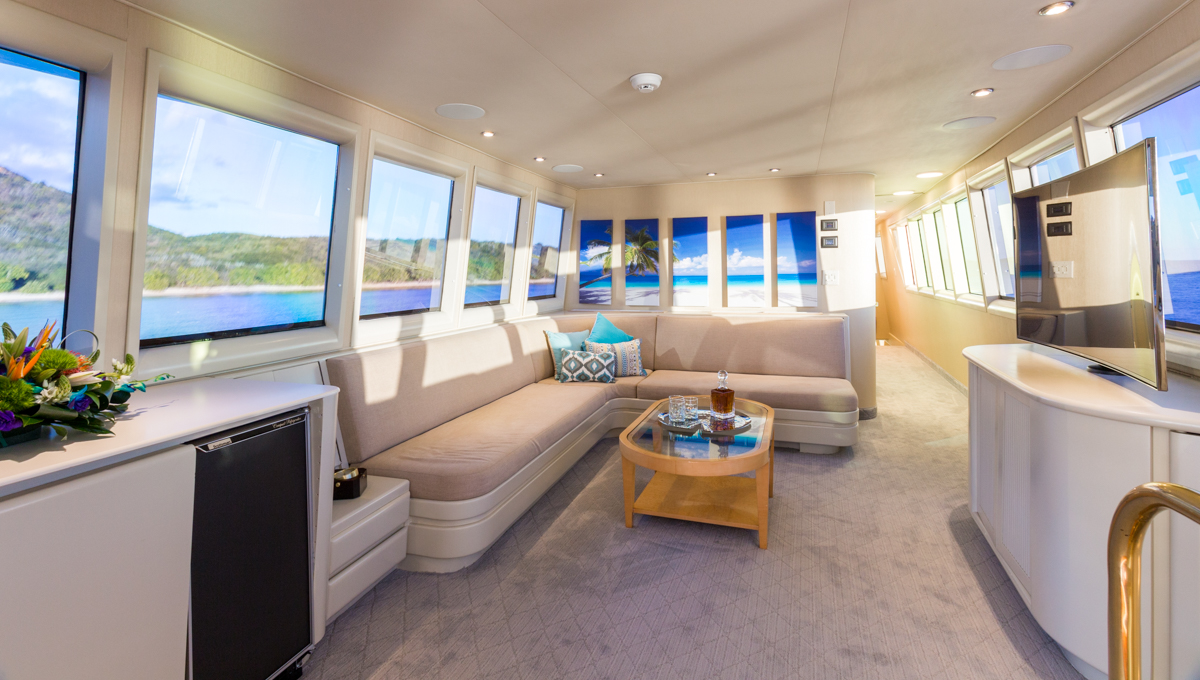 Master Stateroom – Stateroom is on the main deck. King bed with his and her showers and restrooms as well as a 55” Samsung HDTV with Marantz sound system.