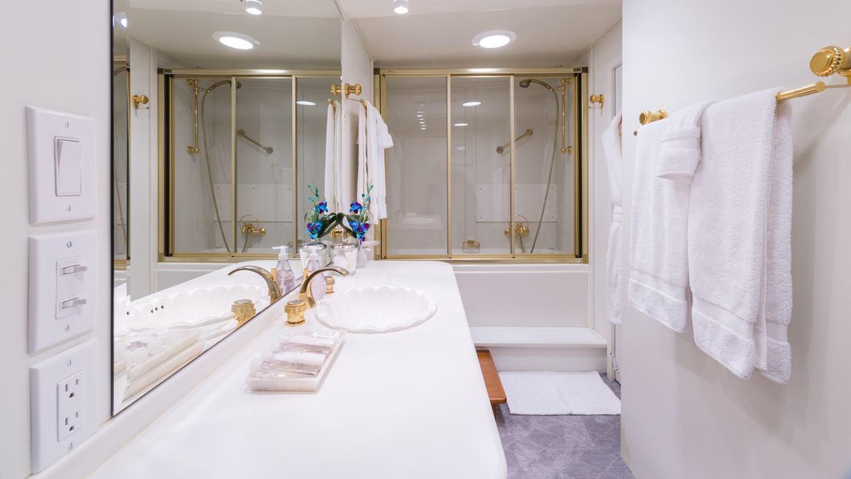 * Mid-ship Stateroom – Queen bed with en suite bathroom. 19” Samsung HDTV