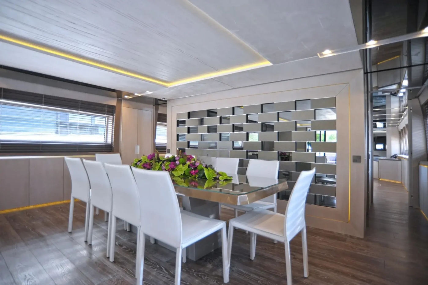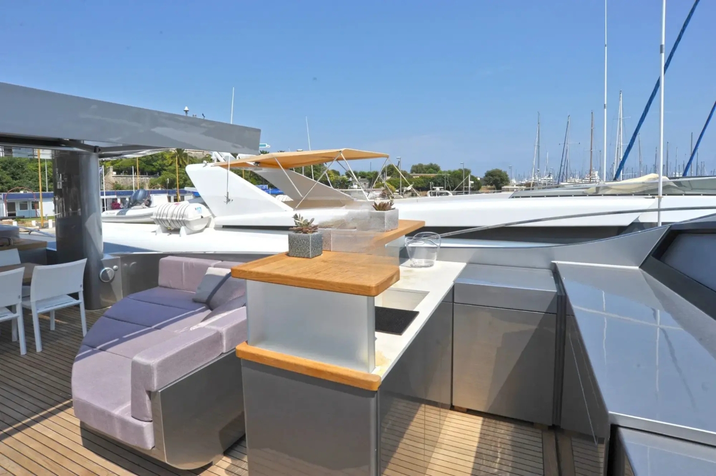 “Al fresco” dining is guaranteed by a 12 guests teak table and a double automatic extensible shade out of the rollbar. A 6 guests Jacuzzi and a large sunbed are providing a very pleasant arrangement for sunbathing on the aft of the flying bridge.